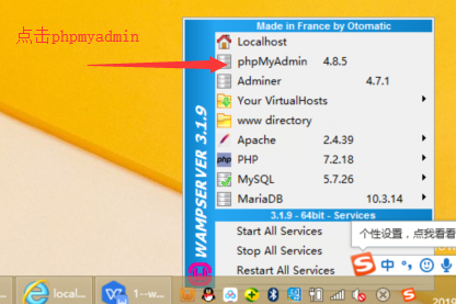 A:鼠標左鍵點擊,電腦右下角底部的WAMP的圖標,在彈出框中,選擇“phpmyadmin”