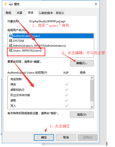 設置權限windows下,我們選擇“users”角色------點擊“編輯”-----然后勾選全部----點擊確定