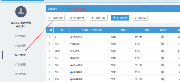一、登錄網站后臺----進入欄目管理