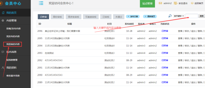 在“我發布的內容”、”我簽核的內容”里面,輸入內容關鍵字、內容ID,即可搜索出所需內容。