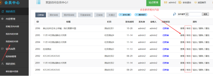 進入各自會員中心,進入“我簽核的內容”(如果是投稿員,點擊【我發布的內容】,可以對待審核的