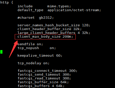 在nginx目錄的conf文件夾中,找到配置文件nginx.conf,調整配置文件中的client_max_body_size 200m;