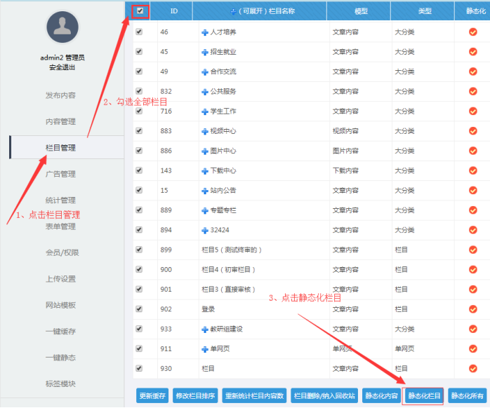 進入后臺----點擊欄目管理-----全選欄目-----點擊“靜態化欄目”。