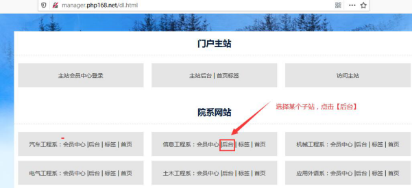 打開統一登錄網址,選擇各自的子站,點擊進入該子站后臺