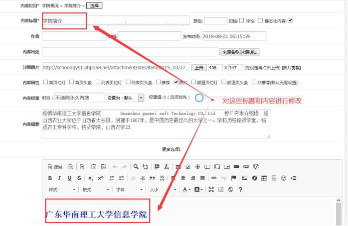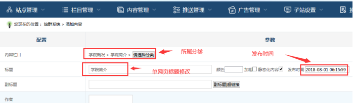 A:下面對單網頁標題、所屬欄目、發布時間進行修改