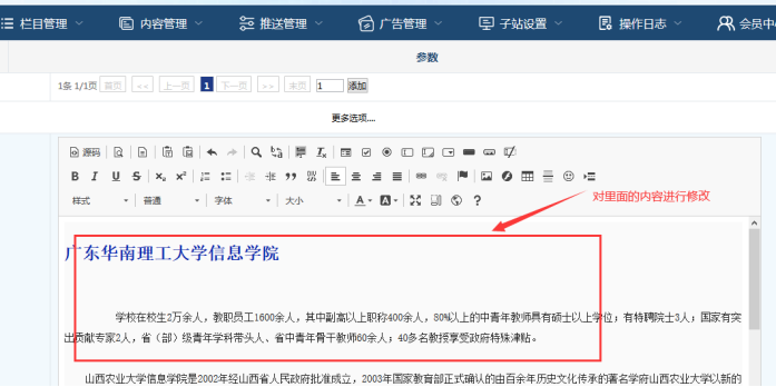 進入子站后臺,點擊【欄目管理】-----點擊展開單網頁一級目錄前面的【+】號-----看到對應的單網頁內容后