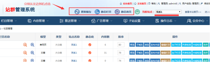 在站群后臺-----選擇對應站點(如果只有一個站點,默認就是自己的站點)----點擊下面的幾個按鈕,從左到右點擊。