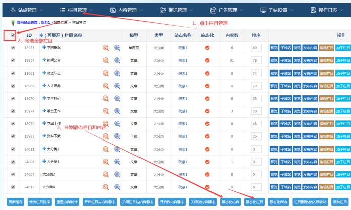 然后點擊【欄目管理】----勾選全部欄目----分別點擊【靜態(tài)欄目】【靜態(tài)內容】:
