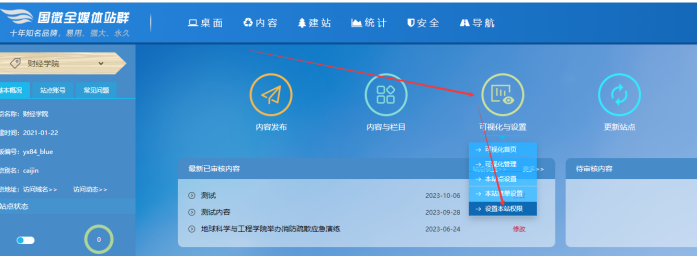 方法:在子網站后臺-----鼠標放在【可視化和設置】按鈕上--------點擊【設置本站權限】: