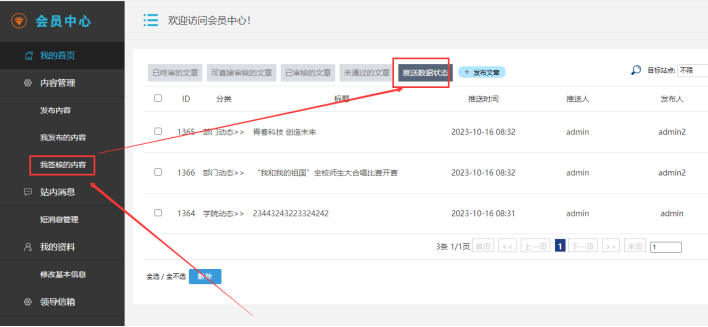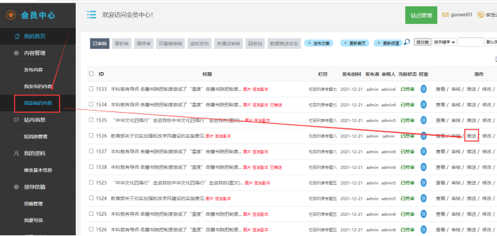 點擊左邊的【我簽核的內(nèi)容】----在對應(yīng)目標(biāo)內(nèi)容的右邊---------鼠標(biāo)放在【推送】按鈕上--------點擊【推送子站】按鈕: