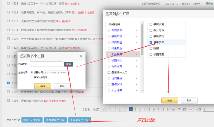 點擊左邊的【我簽核的內(nèi)容】----勾選對應(yīng)的內(nèi)容---------鼠標(biāo)點擊【簽發(fā)到多個欄目】按鈕上,效果如下: