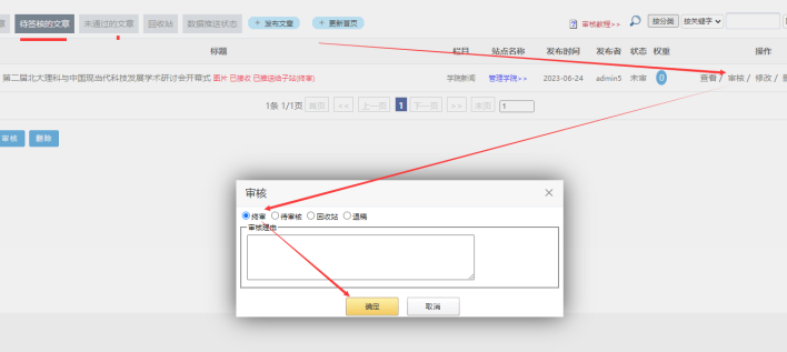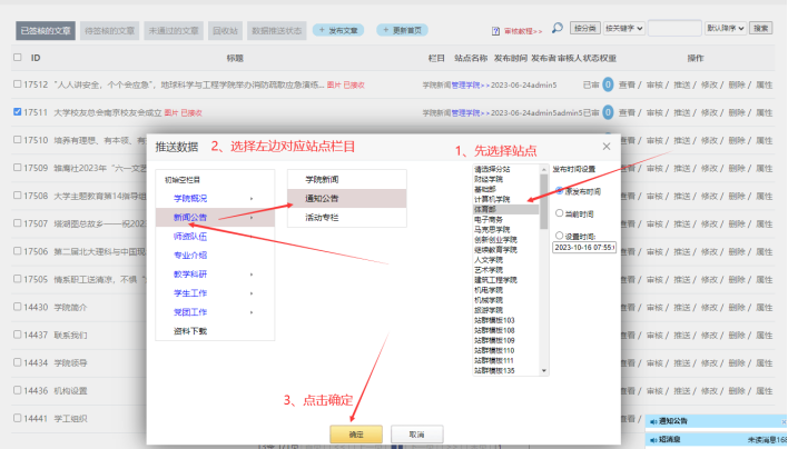 在彈出框中---------選擇需要推送到【主站門戶對應(yīng)的欄目】--------選擇【確定】: