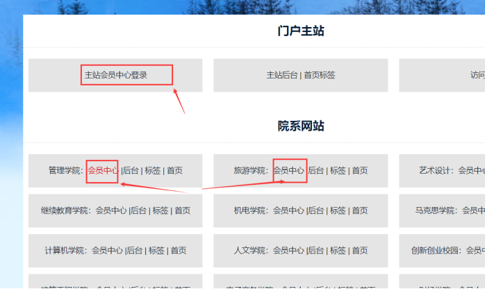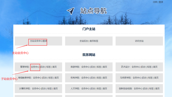 各個(gè)站點(diǎn)管理員需收藏此頁(yè)面,所有用戶在此界面登錄。如果是主站門戶就點(diǎn)擊【主站會(huì)員中心】,如果是子站就點(diǎn)擊各子站【會(huì)員中心】。然后輸入賬戶密碼進(jìn)行登陸即可。