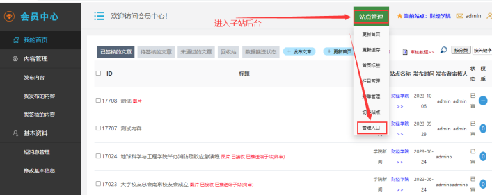A、進入會員中心后,鼠標放在【站點管理】------點擊【管理入口】,輸入賬號密碼后,進入后臺: