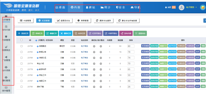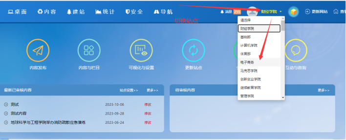 鼠標點擊【對應站點】下拉------點擊【所需站點】----這樣站點就切換了:可以管理對應站點的內容和欄目