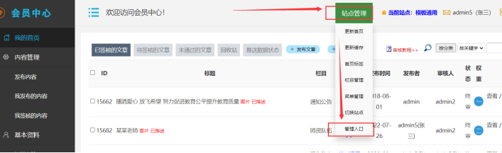 B、點擊【站點管理】----點擊【管理入口】,再次輸入賬戶密碼,進入站點后臺