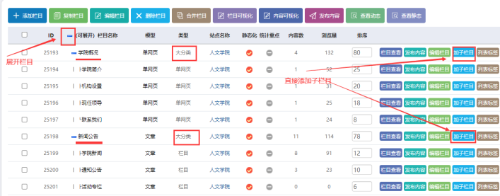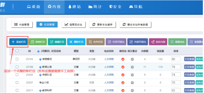 C、點擊【內容】---【欄目管理】,可以進入欄目管理界面