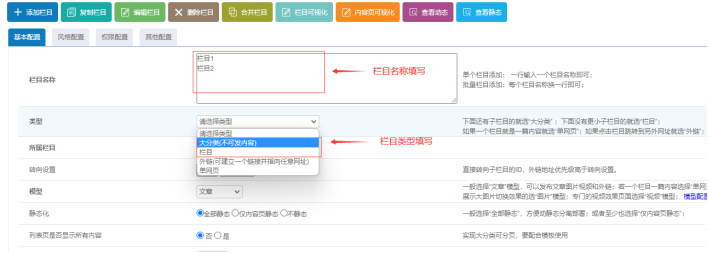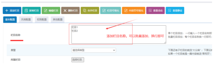 1)、輸入欄目名稱:支持批量添加欄目,一行一個欄目名字即可