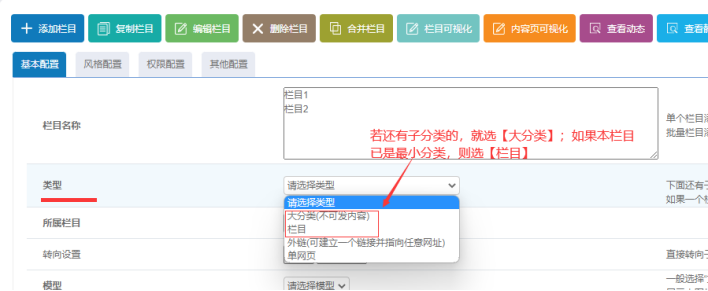 【大分類】:他的選擇標準是:如果此分類下未來還有更小分類,就選擇【大分類】,大分類是不能直接發布內容的。 【欄目】:如果此分類已經是最小分類,就直接選擇【欄目】即可,他是可以發布內容的。