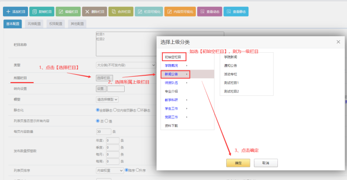 3)、選擇所屬欄目:我們要判斷這個分類屬于哪個【上級】目錄,這里就要做個選擇。點擊【選擇欄目】-------彈出框中【選擇對應的所屬分類】,這里有兩種情況: