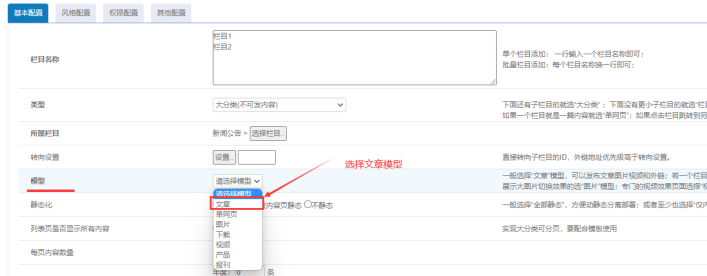 我們最常用的欄目類型就是【文章】模型,文章模型里面可以發布文章、下載、視頻、圖片等,是通用性的模型。