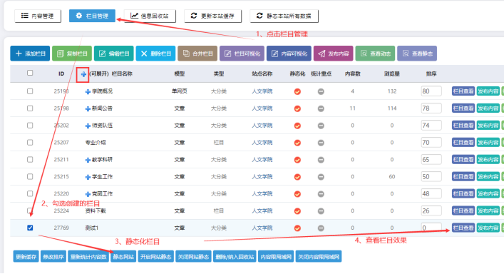 點擊【欄目管理】------點擊【展開欄目】------勾選這個創建的欄目-----點擊【靜態網站--靜態欄目】---再點擊【欄目查看--查看靜態預覽】。