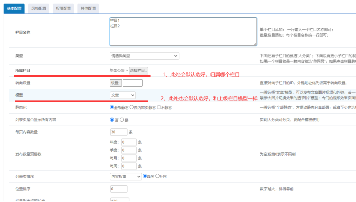默認選好的選項:這種方式添加會默認選好【所屬欄目】、【模型】,會讓我們省事不少,如下: