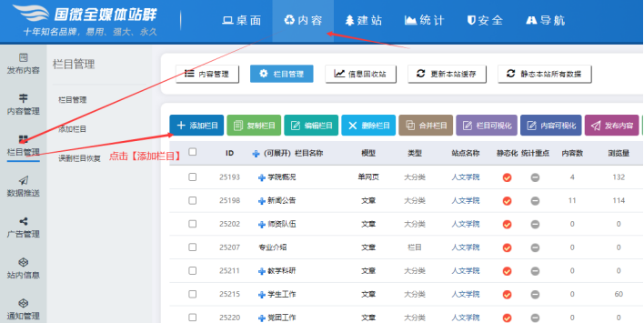 C、點擊【內容】---【欄目管理】----【添加欄目】,可以進入添加欄目管理界面