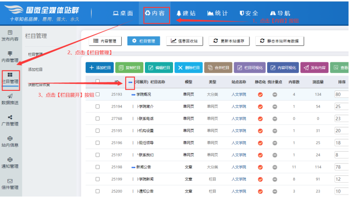 C、點(diǎn)擊【內(nèi)容】---【欄目管理】,可以進(jìn)入欄目管理界面