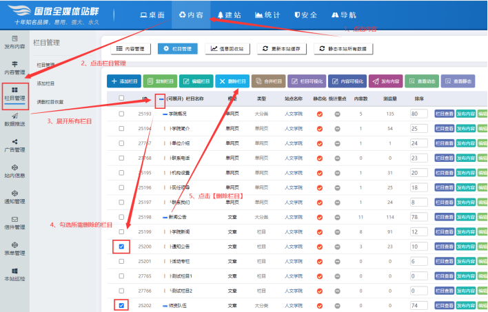 進(jìn)入欄目管理界面后,【展開所有欄目】-----【勾選所需刪除的欄目】-------點(diǎn)擊【刪除欄目】