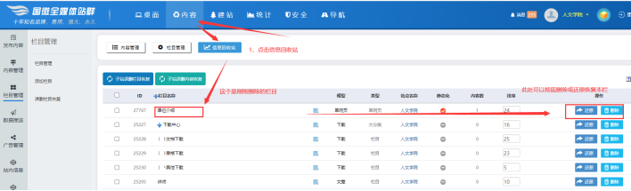 然后后的欄目會進(jìn)入這個【欄目回收站】,可以進(jìn)行【欄目恢復(fù)】或【徹底刪除欄目】的操作:
