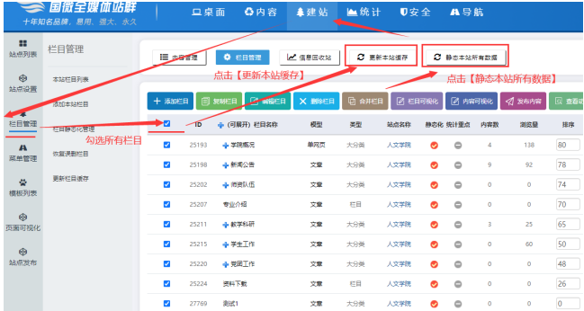 點(diǎn)擊【欄目管理】-----點(diǎn)擊【勾選所有欄目】-------點(diǎn)擊【更新本站緩存】----點(diǎn)擊【靜態(tài)本站所有數(shù)據(jù)】-------然后打開對應(yīng)欄目預(yù)覽,刷新幾次即可看到最新效果