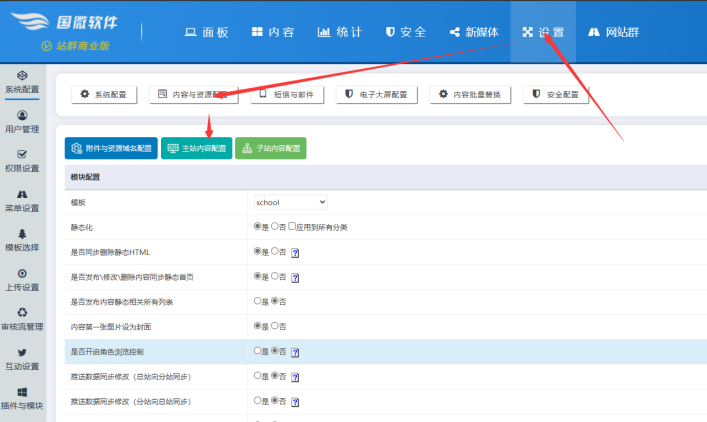 C、進入后臺之后,點擊【設置】----點擊【內容與資源面板】----點擊【主站內容配置】