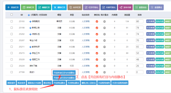 -------鼠標放在底部的【開啟網站靜態】狀態------點擊【開啟所有網站欄目和內容靜態】