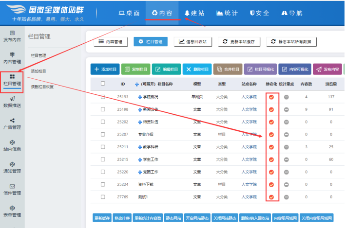 說明:我們的網站絕大部分時候,都是用靜態化的形式對外展示,為什么要靜態化呢,因為靜態化的網頁都是html格式的,不需要讀取數據庫,讀取速度快,并且無需連接數據庫。我們需要確認三個關鍵步驟,分別是“欄目是否開啟靜態化”、“菜單導航是否已是靜態化地址”、“執行靜態化操作”