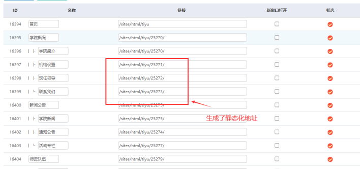 這樣我們看到所有菜單都生成了靜態化地址,靜態化地址的標志就是“/”斜桿:這樣菜單靜態化地址就為完成了。