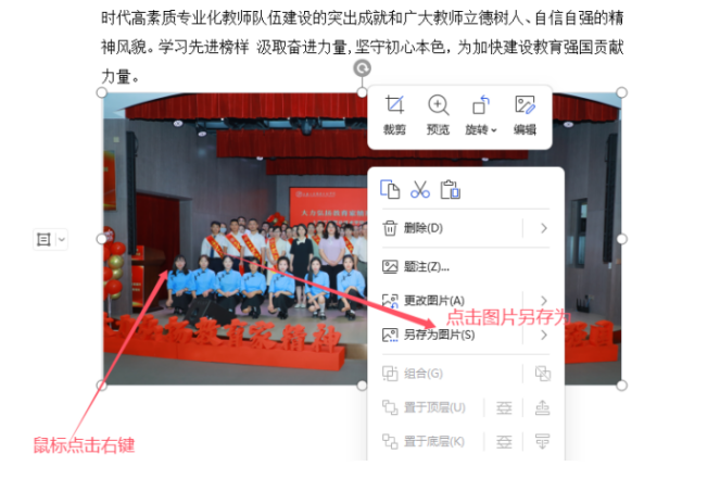 A、我們打開一個覺得有異?!緒ord文檔】------如果暫時不能估計文檔中哪個圖片比較大,那么就將所有圖片都保存到本地文件夾中------先鼠標選定一個圖片,鼠標右鍵-------彈出框中,點擊【另存為圖片】:
