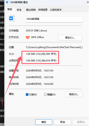 判斷標準: 如果一個word文檔大小超過了4M或5M,大概率判斷他的圖片是有問題的;里面有可能一張圖片達到了30M或更大的可能。上面的箭頭顯示的word文檔達到了126M,意味里面里面的圖片達到了100M一張的可能性。