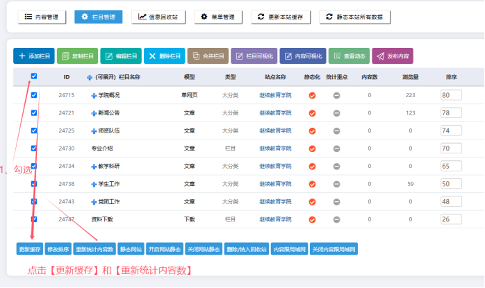 勾選所有欄目后-----分別點擊【更新緩存】、【重新統計內容數】: