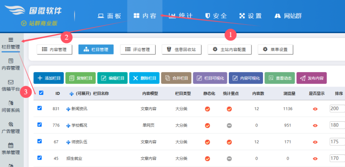 點擊【內(nèi)容】導航-------點擊【欄目管理】-----點擊勾選【所有欄目】