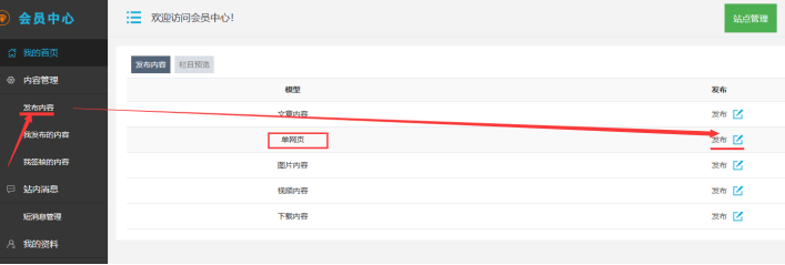 進入會員中心后----------點擊【發布內容】-------在單網頁模型右邊,點擊【發布】 :