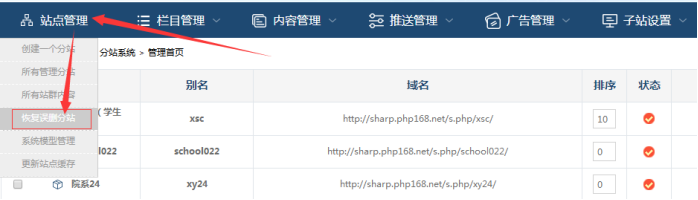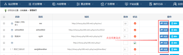 備注:如果在子站回收站列表中,如果刪除了這些站點,未來將無法恢復(fù)了: