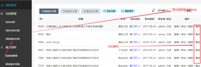 進入后------點擊我簽核的內容----點擊屬性(先搜索出所需推送的內容)-----點擊后會提示登陸后臺,則登錄后臺