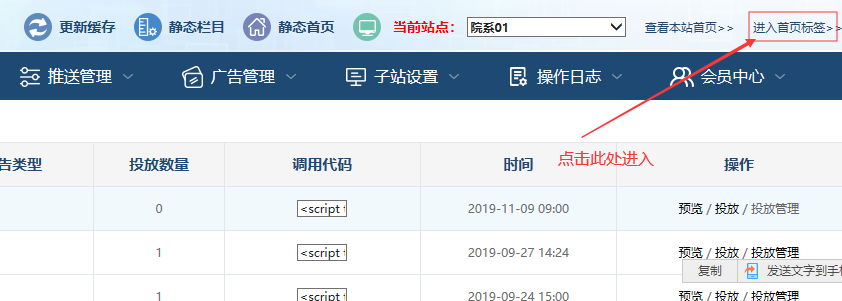 廣告設(shè)置好后,需要網(wǎng)站有效果:需要更新標簽緩存------靜態(tài)該站首頁----刷新首頁才有效果。